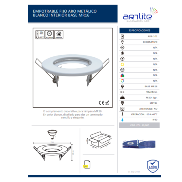 EMPOTRABLE FIJO ARO METÁLICO BLANCO INTERIOR BASE MR16 / ARTLITE / ADE-102